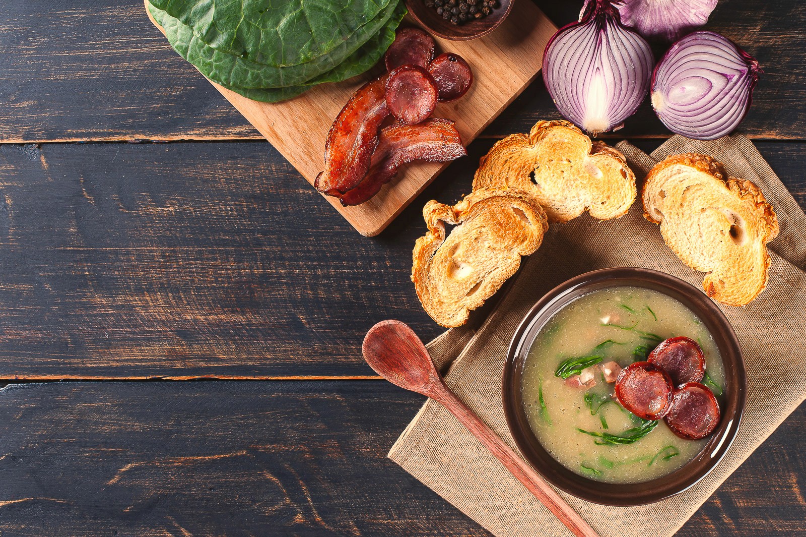 Caldo verde is a simple but delicious recipe that highlights healthy kale. However, it is not all vegetables and is normally flavored with Portuguese chouriço. Thickened with pureed potatoes and flavored with garlic, this kale soup satisfies both hunger and taste in unison.